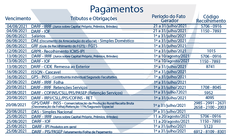 Agenda Tributária Agosto 2021