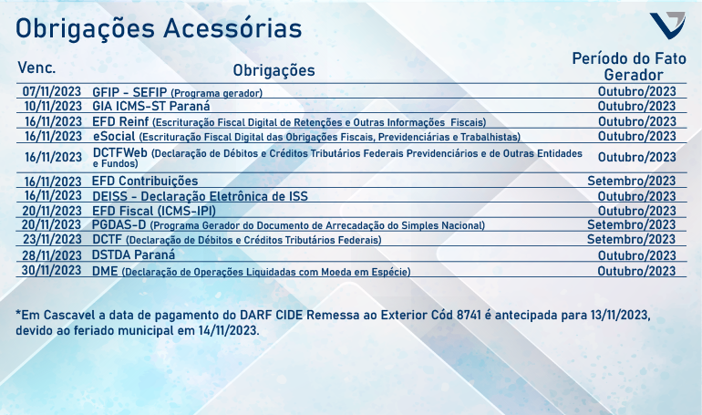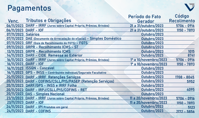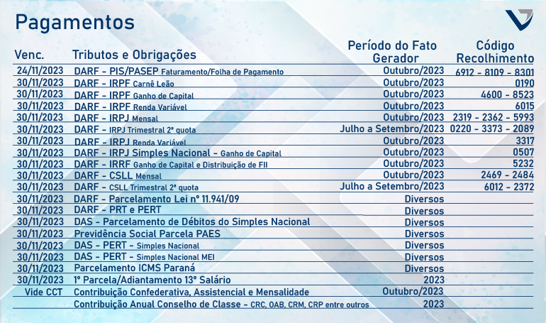 Agenda Tributária Novembro 2023