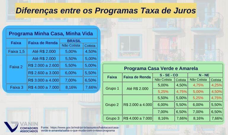 Outra diferença entre os dois programas é que no MCMV a taxa de juro era única para todo o País, variando conforme a faixa de renda da família. Já com o Programa Casa Verde e Amarela, a taxa de juros é variada, considerando a faixa de renda da família e a localidade do imóvel, os moradores do Norte e Nordeste tem redução nas taxas.