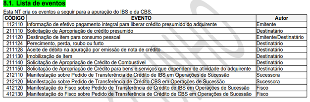 O detalhamento de cada evento e seu respectivo uso podem ser consultados na Nota Técnica 2025.002 e suas atualizações disponíveis no portal da NF-E: https://hom.nfe.fazenda.gov.br/portal/listaConteudo.aspx?tipoConteudo=04BIflQt1aY=,e sua uso será essencial para a apuração no novo regime.